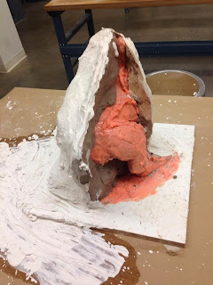 I finished sculpting it, and now I need to make a mold for it. Another goal of my for this class is that I want to learn how to make molds and different ways of casting pieces. After, I'm done with school here, I was planning on going to Makeup School for special effects. A really important quality of special effects is mold making and casting prosthetics. So this way I can make projects for class but at the same time learn molding techniques for the future.